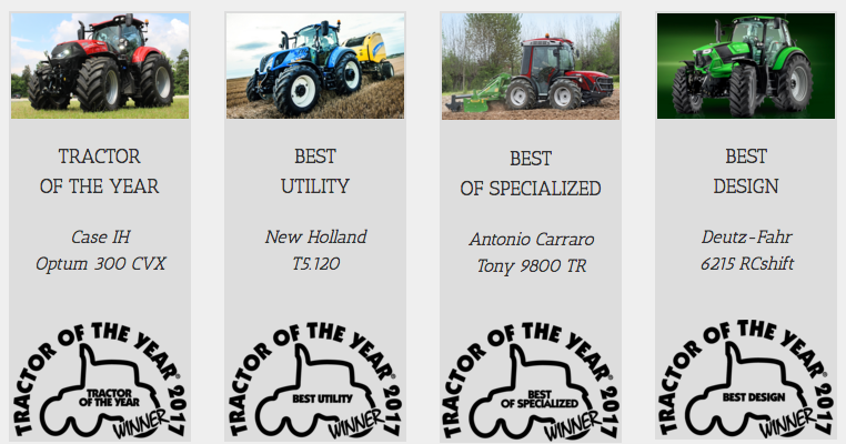 The TOTY Awards were started in 1998 by an Italian publication, and the idea has become very popular in Europe. Winners are announced at the Italian EIMA show and Agritechnica in Germany on alternating years.