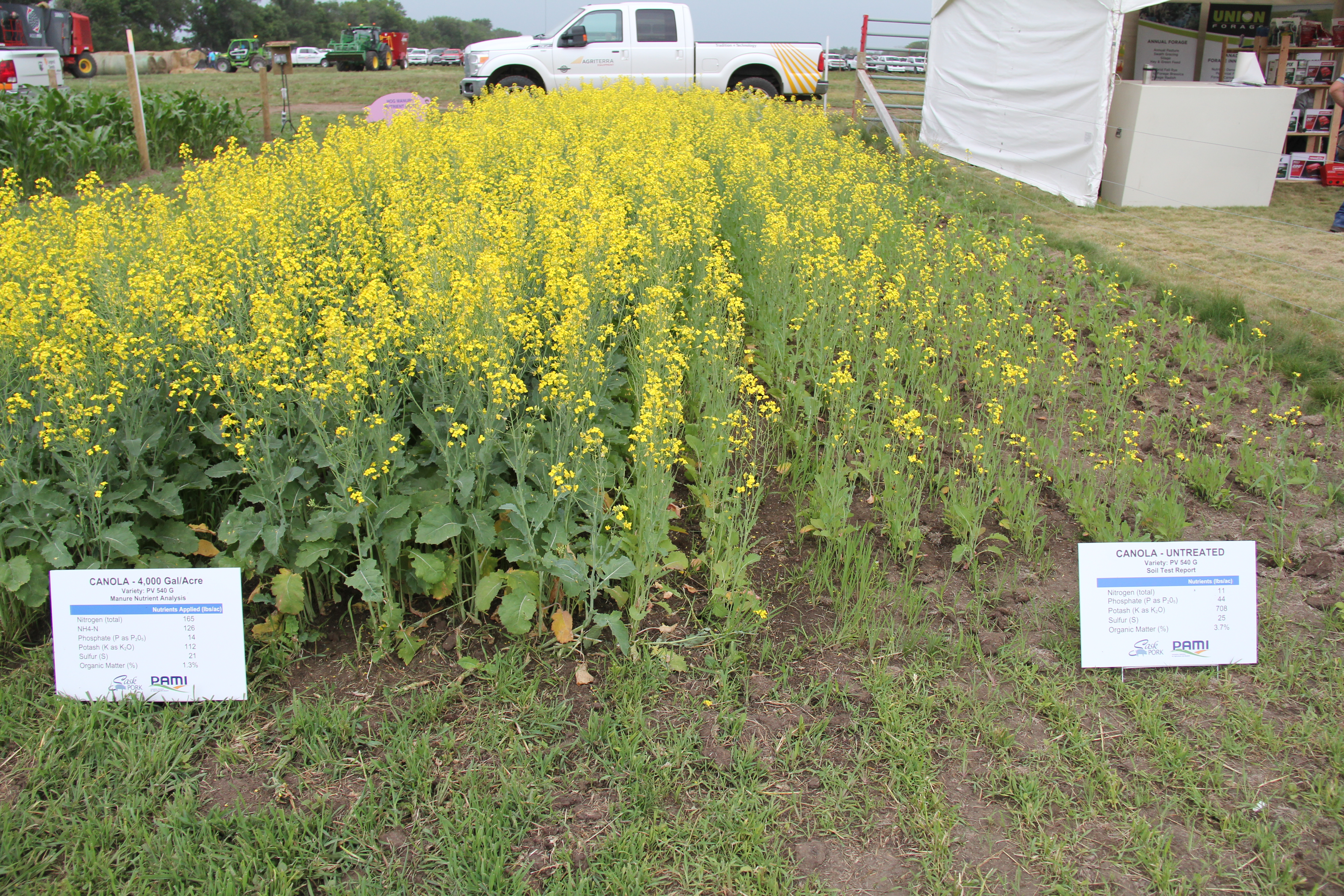 As part of their display at AIM, Sask Pork had demo plots of cereals and canola with some quite dramatic side-by-side comparisons of crop fertilized with hog manure next to plots that had not been fertilized. Hog manure was applied at rates varying from 8,000 to 4,000 gallons per acre.