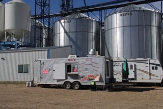 Mic’s food concession trailer isn’t as randomly located as it may sound. The trailer is actually in the yard of a large grain handling system owned by farmer Michael Kroetsch. The food trailer is located in the shadow of about 1.5 million bushels of grain bins used to hold some of the Kroetsch farm crop. Her husband Rob is actually one of the B-train drivers working for Kroetsch this harvest.
