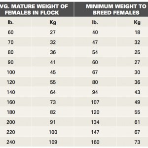 Another consideration for increasing productivity of our ewes is earlier breeding. There is mounting evidence that ewe lambs that cycle/breed to lamb at or near their first birthday are more fertile in their lifetime. There are considerations though, such as size, before one can breed ewe lambs. This chart from Premier 1 Livestock Supplies is a handy reference tool. It is also a consideration that ewe lambs will need a higher amount of feed to grow themselves and fetuses so separate penning should be a consideration.