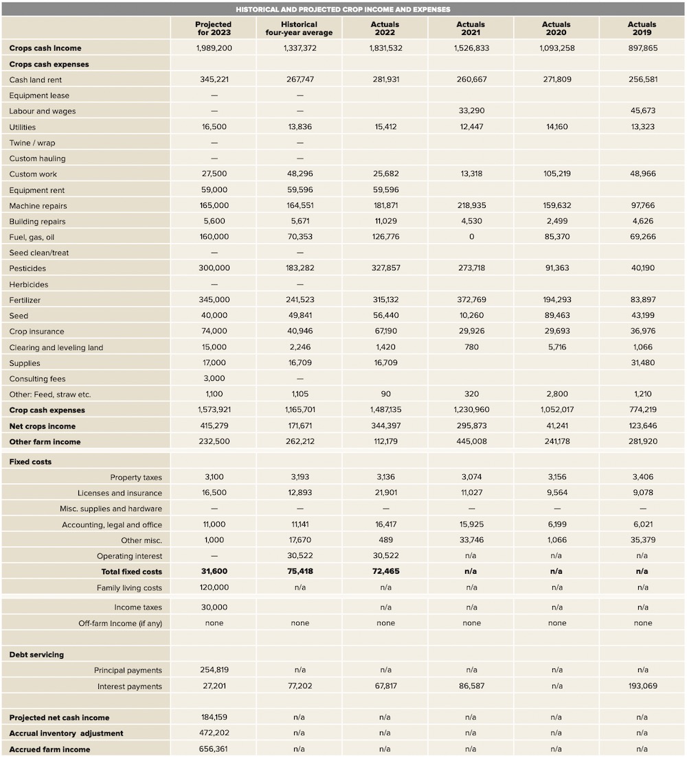Of course you have to adjust for increases in costs, changes in acres farmed, different crop rotations et cetera; then you have to do the same for the farm’s fixed costs, loan payments and personal living expenses. This example includes $120,000 for family living expenses, which is for two families.