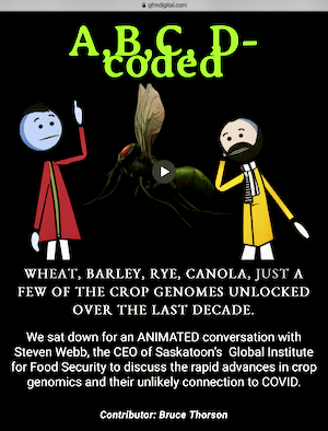 In one of his contributions to the site, Bruce Thorson, our multimedia expert and producer, sits down for a conversation with Steven Webb, the Global Institute for Food Security’s CEO, to discuss the rapid advances in crop genomics and their unlikely connection to COVID-19. It’s completely animated (click the ‘A, B, C, D-coded’ image at left to visit the page and watch it).