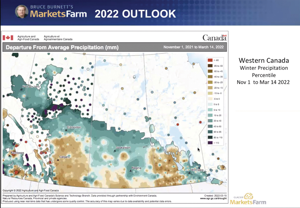 For those southern growing areas, Burnett says, due to below-normal snowfall this winter combined with the drought conditions last year and severe subsoil moisture deficits, “we really, really need spring rains.”