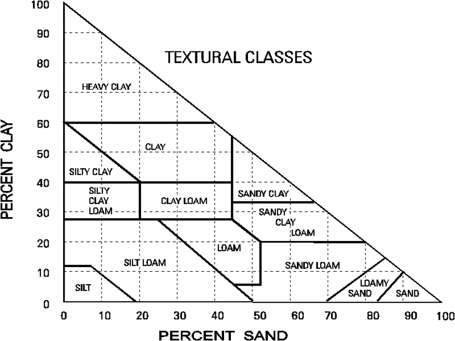 A loam-textured soil is typically made up of about 40 per cent sand, 40 per cent silt and 20 per cent clay. Table 1 (below) provides the approximate amount of available soil water that can be held by various textured soils.