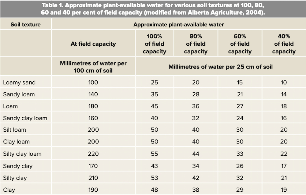 From Table 1 (above), a clay loam soil will hold about 50 mm of water per 25 cm of soil at field capacity and 30 mm of water per 25 cm of soil at 60 per cent field capacity. Therefore, 50 mm + 50 mm + 30 mm + 0 mm = 130 mm of water in the 0 cm to 100 cm soil profile.