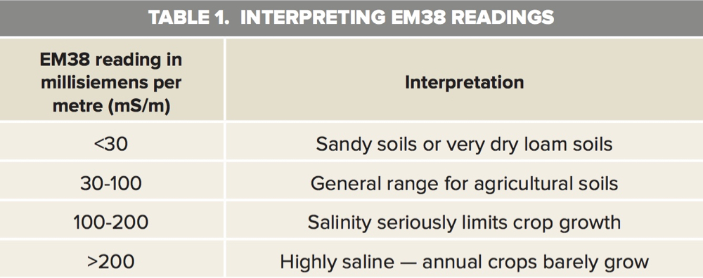 The EM38 always spits out a number that is affected by soil temperature, soil texture, soil water and soil salinity. It is up to the user to interpret that number. Table 1 shows the “broad strokes” of interpreting what the EM38 is telling you.