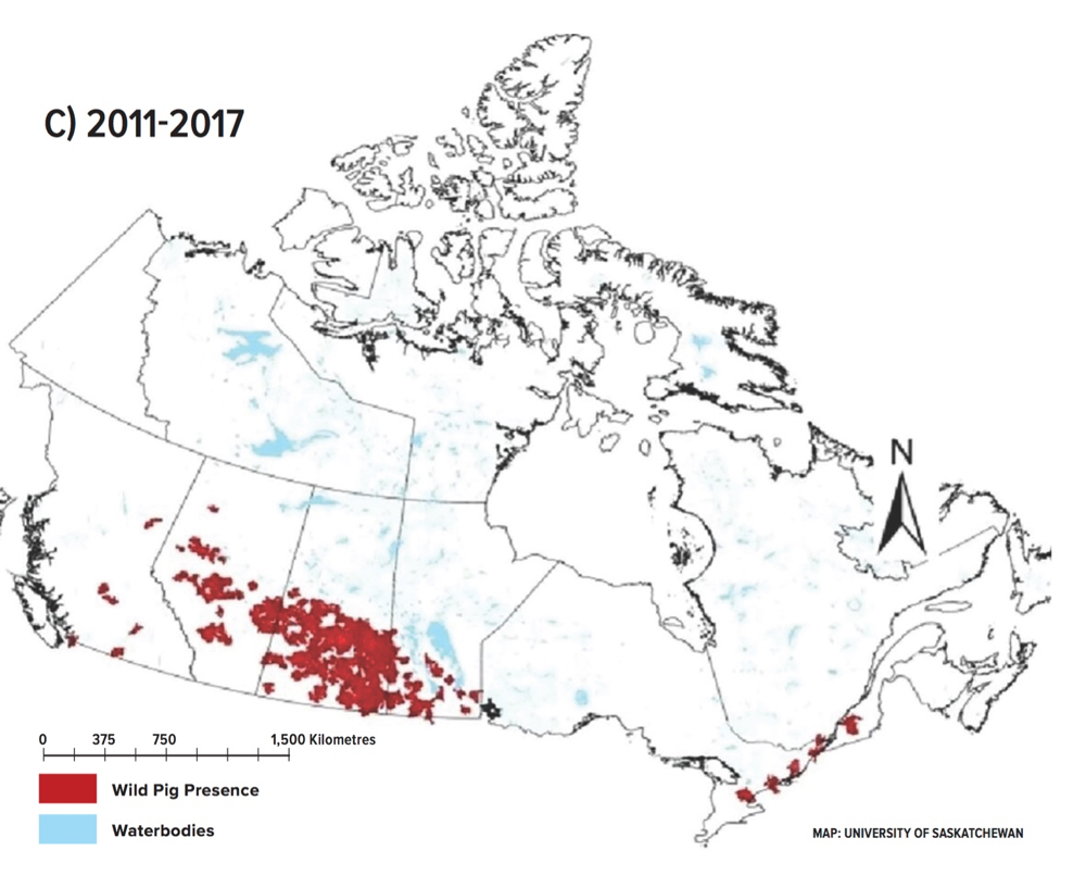 From a smattering of sightings of escaped wild boar identified in 2000, large swaths of central and southern Alberta, Saskatchewan and Manitoba are now the habitat for the ever-expanding wild boar numbers. Brook estimates the wild pigs will expand into another 80,000 square kilometres per year in Canada. That is a lot of bacon on the move.