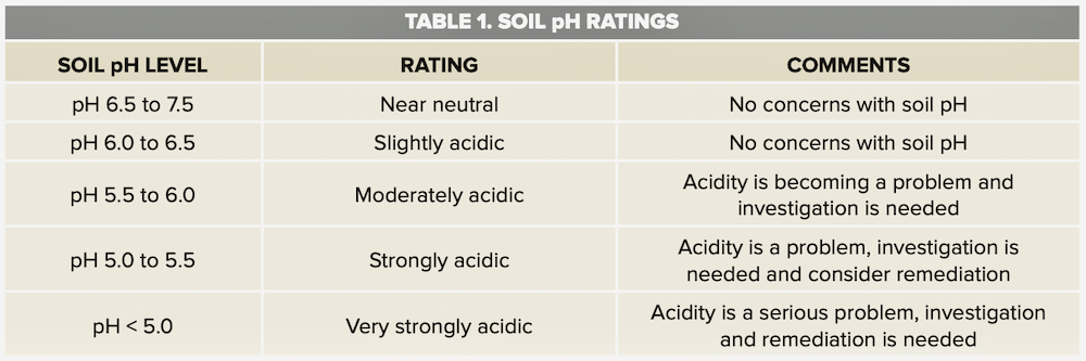The starting point to remediation is soil testing to determine pH. This is critical to establish the areas or soil management zones in a field where soil pH is low. Then, in the areas that are low, a lime requirement test for each area can be done to determine the ideal rate of lime for each zone.