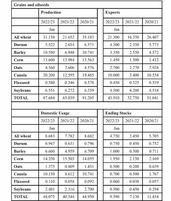 Tables: January estimates for Canadian major crops’ supply and demand, in millions of metric tonnes. Source: Agriculture and Agri-Food Canada.