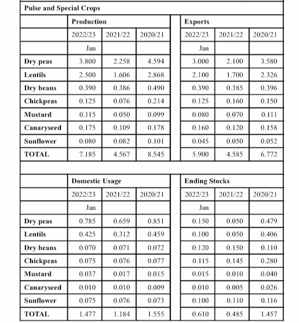 Pea and lentil acres are both expected to see slight increases on the year, at 4.08 million and 4.45 million acres respectively. Pea production is forecast to be up by 68 per cent, at 3.8 million tonnes, while lentil production is expected to be up by 56 per cent at 2.5 million tonnes.