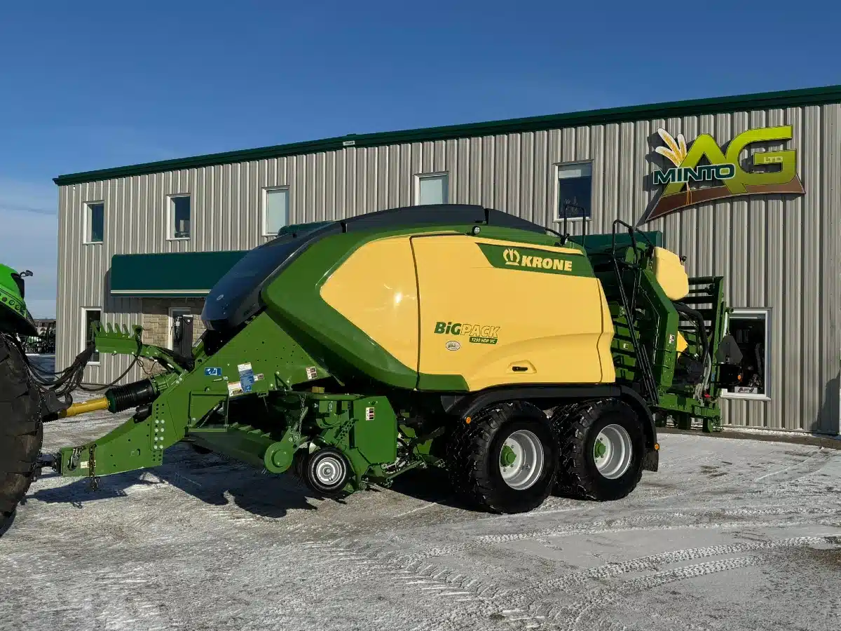 As the Duecks produce hay for their own cattle and market quality hay as well, they were producing a lot of small rectangular bales that required a lot of handling. The Multi Baler features three small rectangular bales wrapped inside a medium-size bale that weights about 600 lbs.
