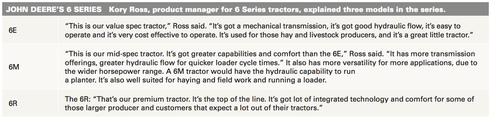 John Deere has revamped its 6 Series tractor family by upgrading the specifications of its 6D line and renaming them the 6E. That means the mid-sized 6 Series family now includes the 6E, 6M and 6R tractor lines.