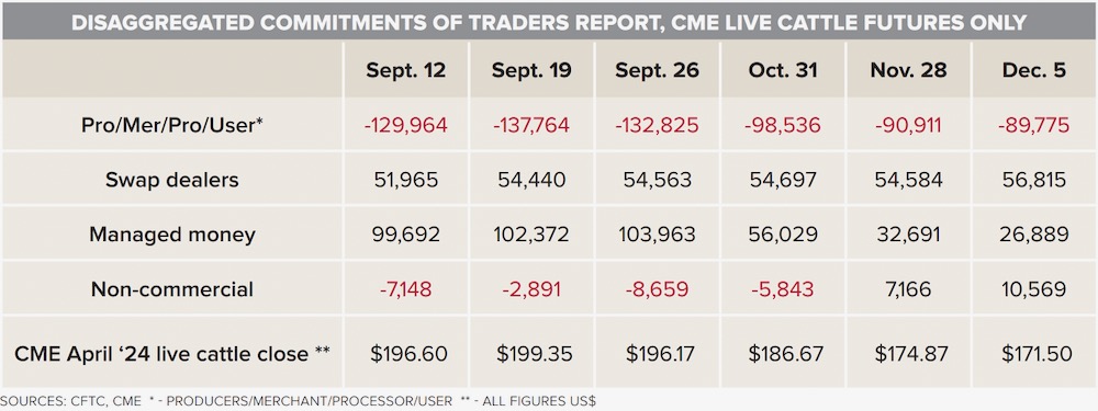 It’s important that cattle producers have a good idea of the futures position of each group of participants in the market. When the commercial and managed-money positions are at an extreme low or high, this is a turning signal for the market.