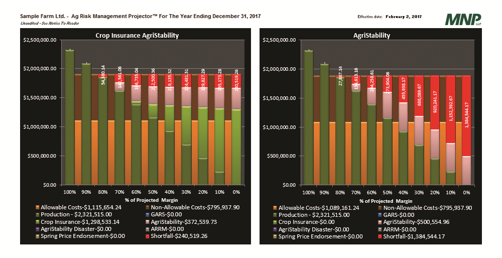 The output from the ARMP is a series of side-by-side graphs. Those graphs show estimated revenue for all crops if everything goes as planned, as well as 10 other possible scenarios with lost revenue in 10 per cent increments down to a complete crop loss. The ARMP graphs also factor in the costs for inputs and expenses, as well as the costs for the various insurance programs under consideration to demonstrate what you’re paying for and the impact it could have on your profit margin. “We’re trying to model a complete income statement on an accrual basis,” says Funk.